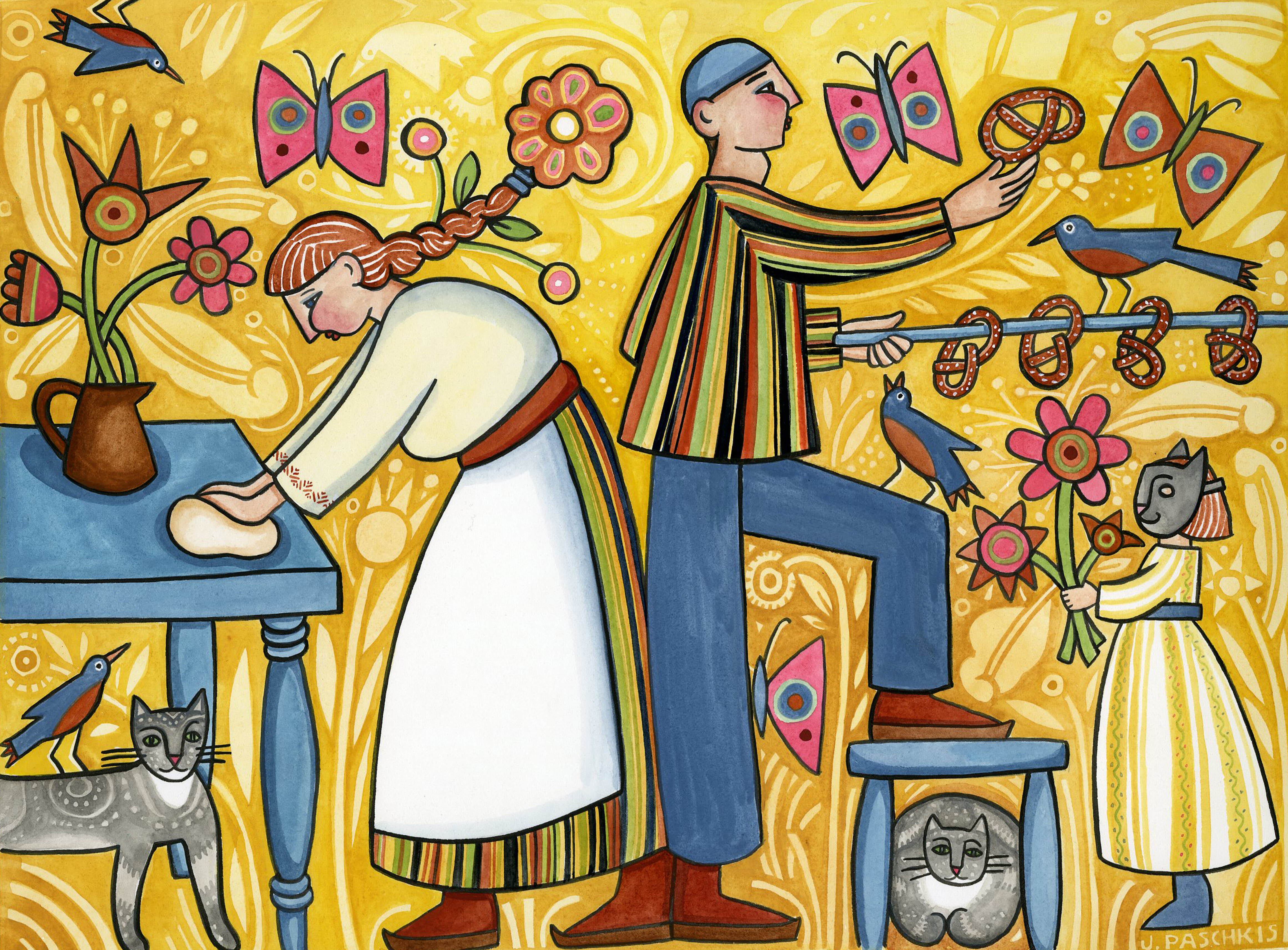 Since 1991 I have been painting and illustrating full time. I have had many shows of my paintings and of various other work (including cut paper, embroidery and bread). I illustrate books. I design fabric and make quilts. My work flows in many directions, but all of the ideas and creations are connected. The work I do in one area inspires the work in others. Ideas beget ideas.