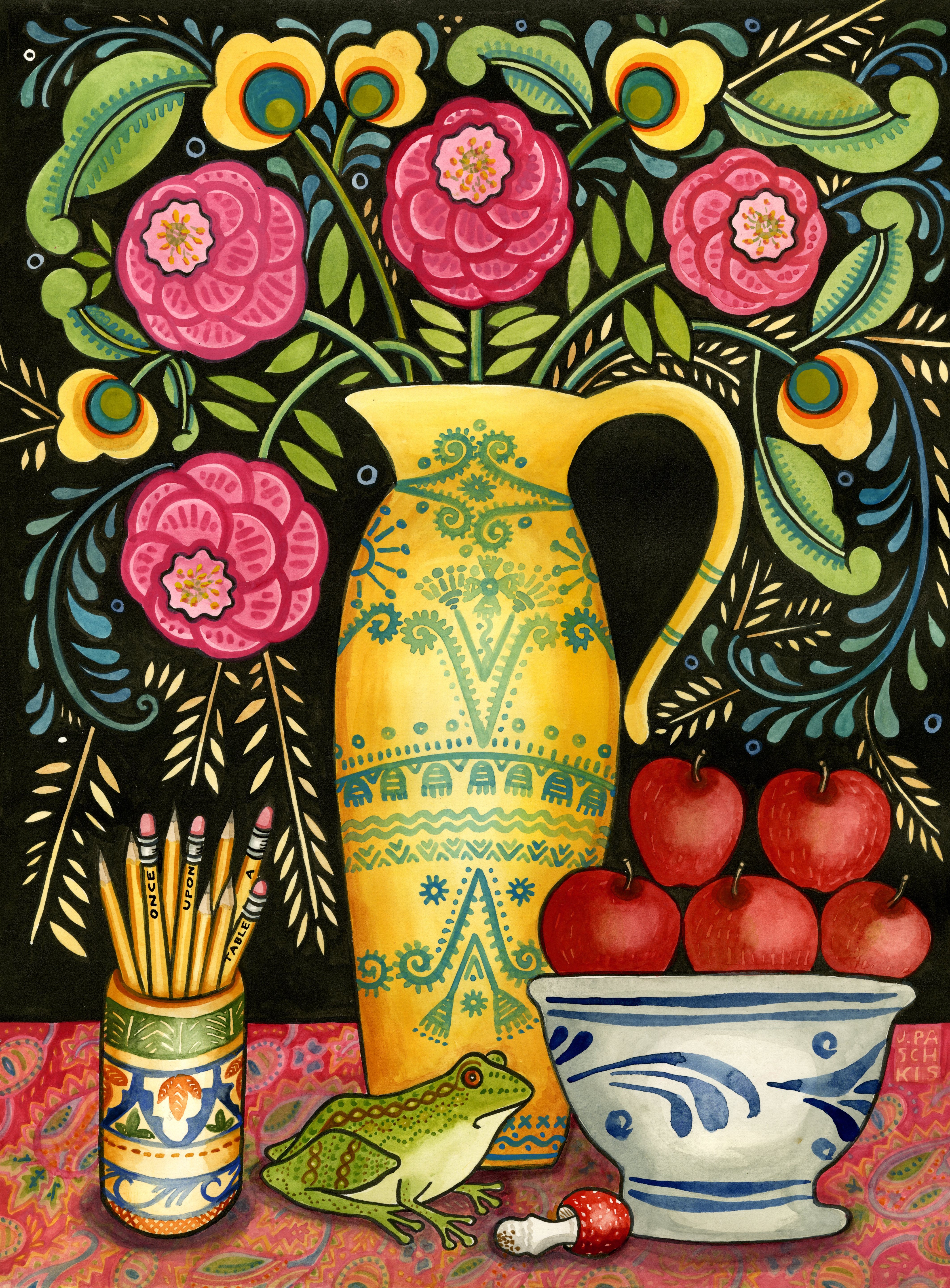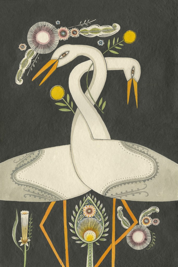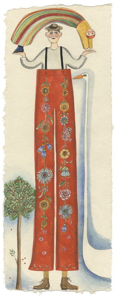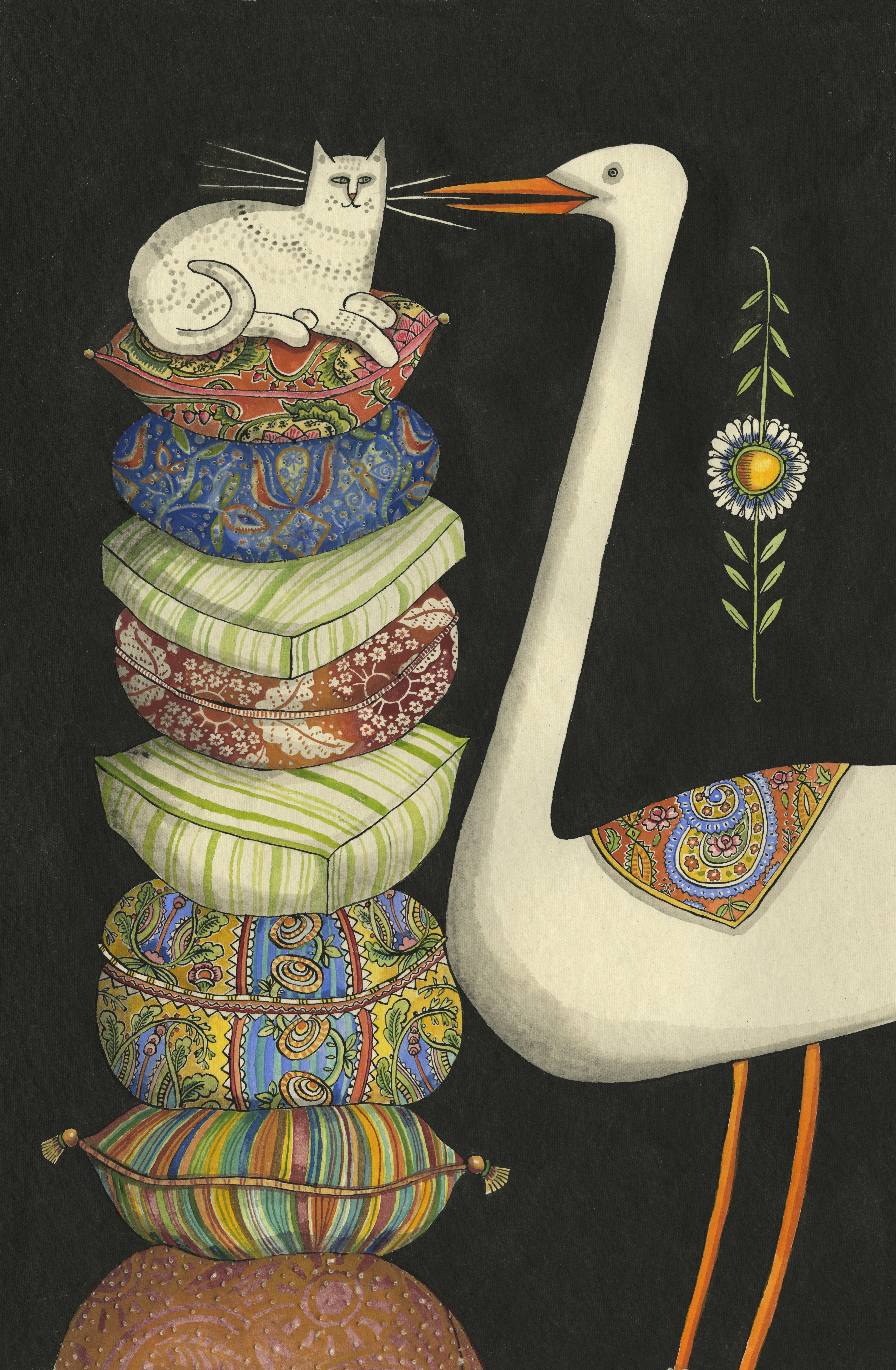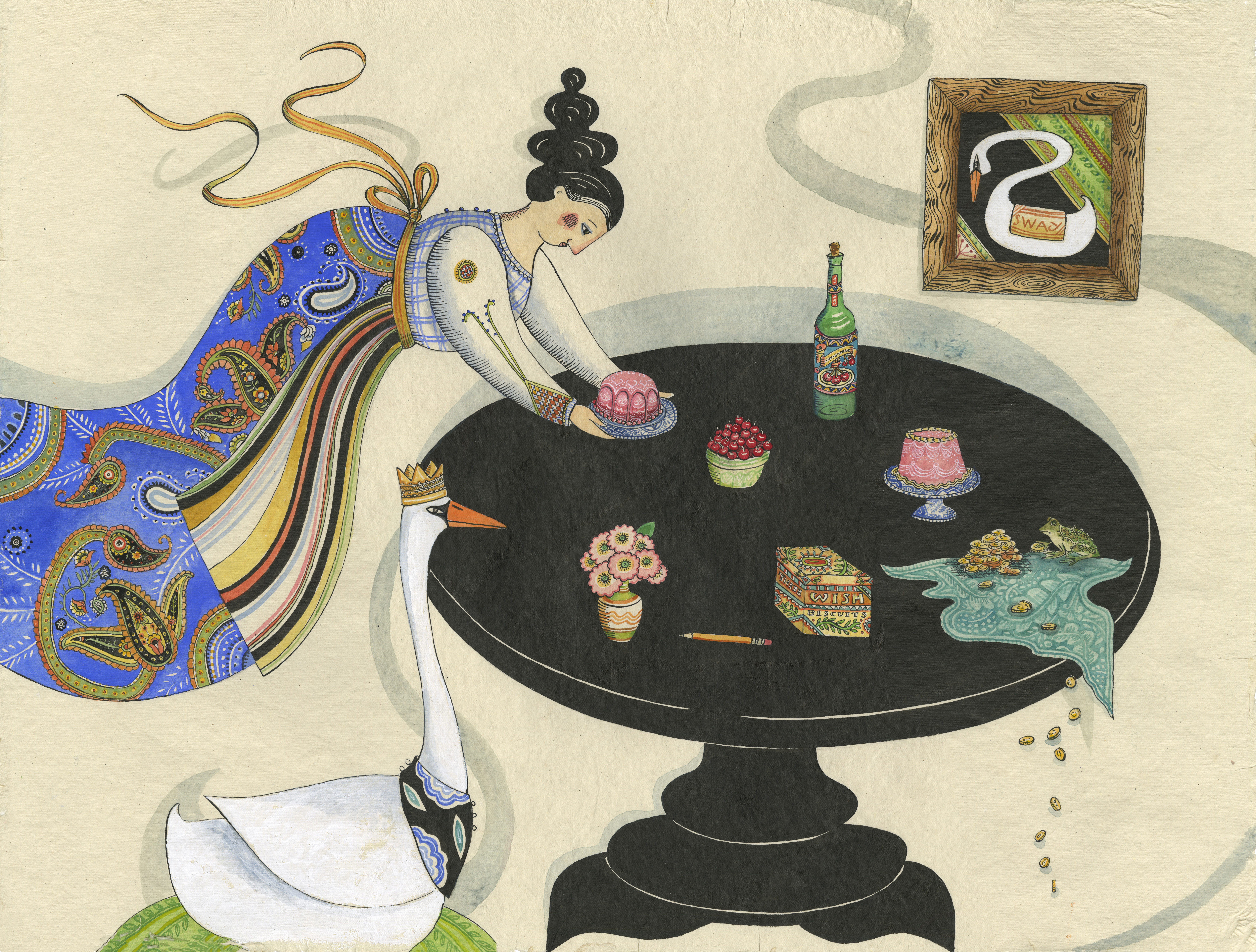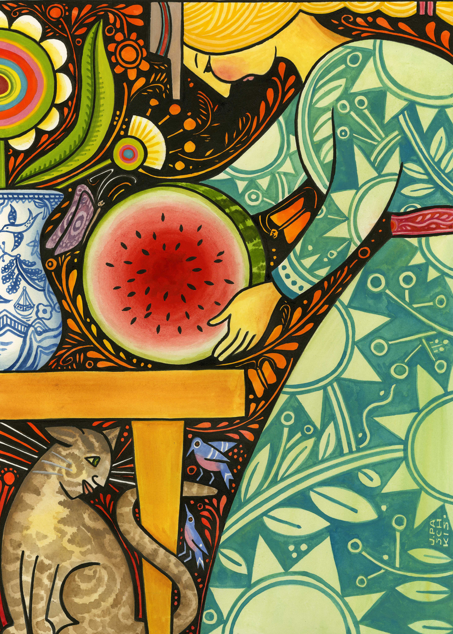 Most of my paintings are gouache and ink on paper. I also make work with different media like cut paper, stencil, embroidery and bread. The wandering that I do in my studio work keeps me alive creatively and feeds all of my other work.