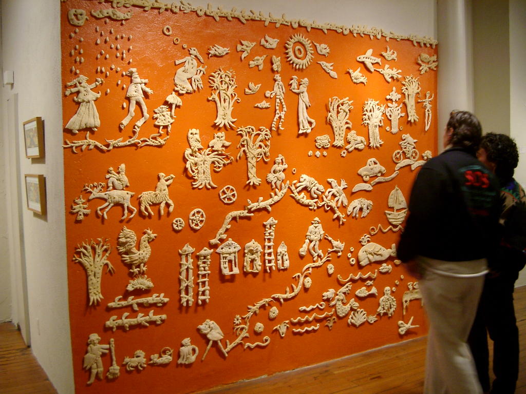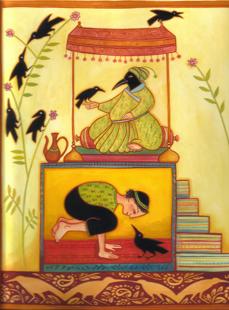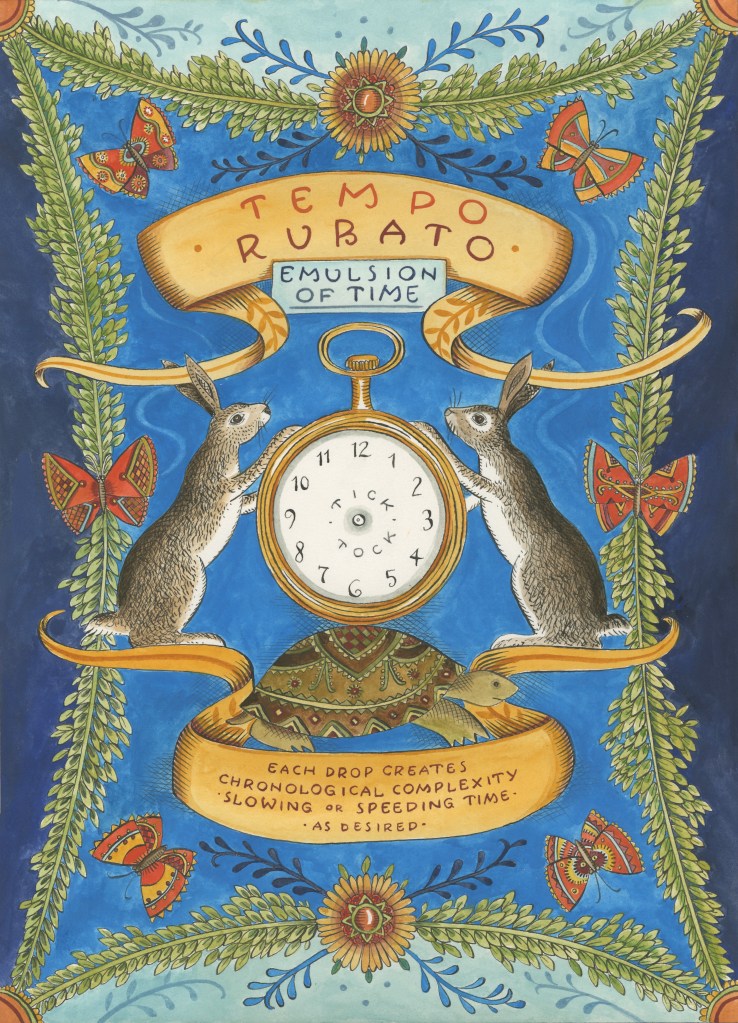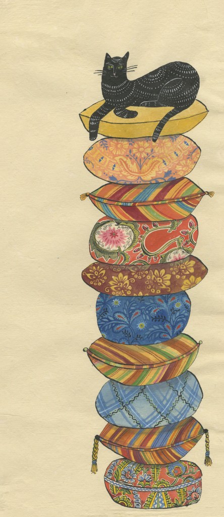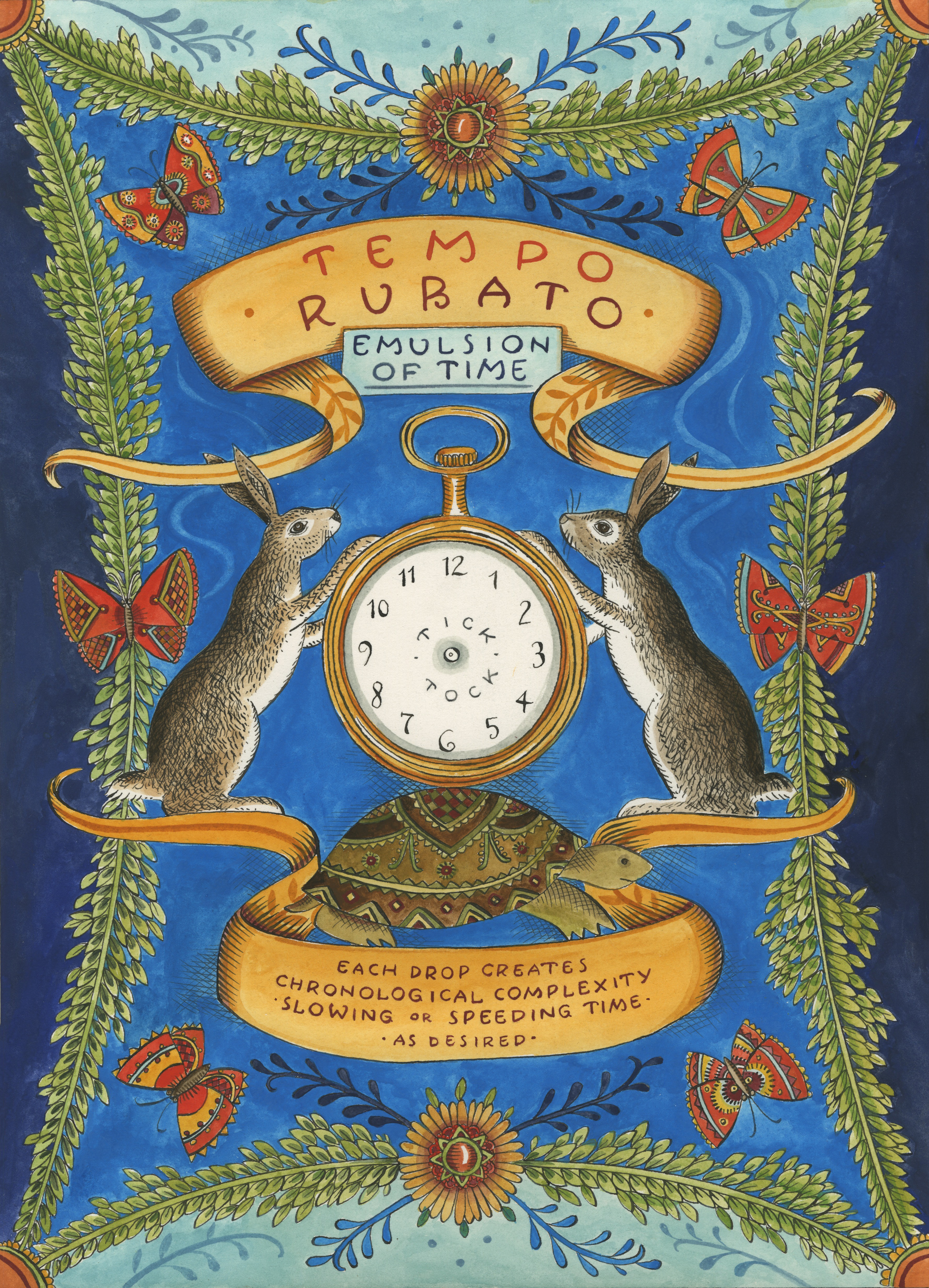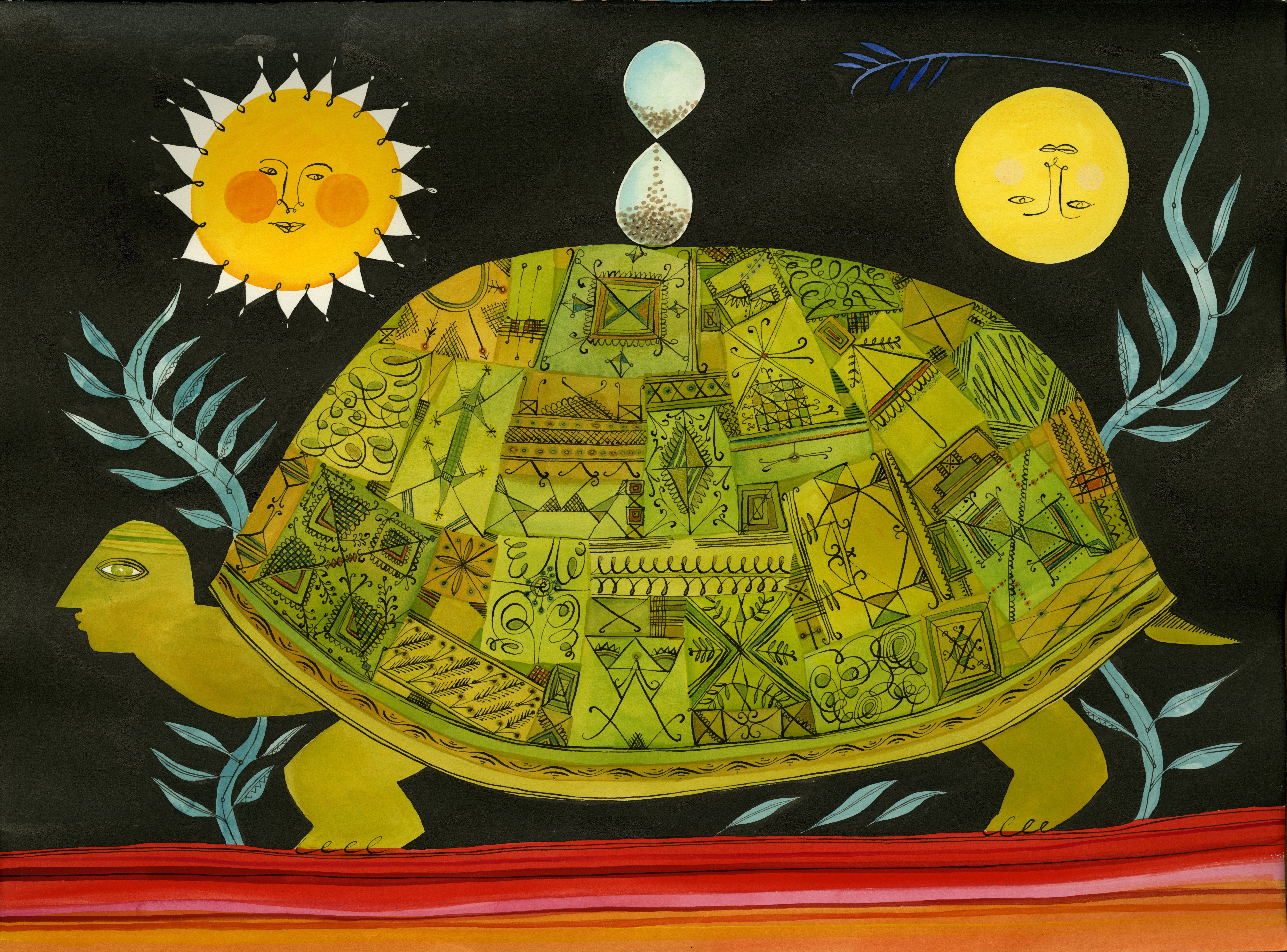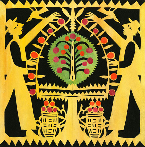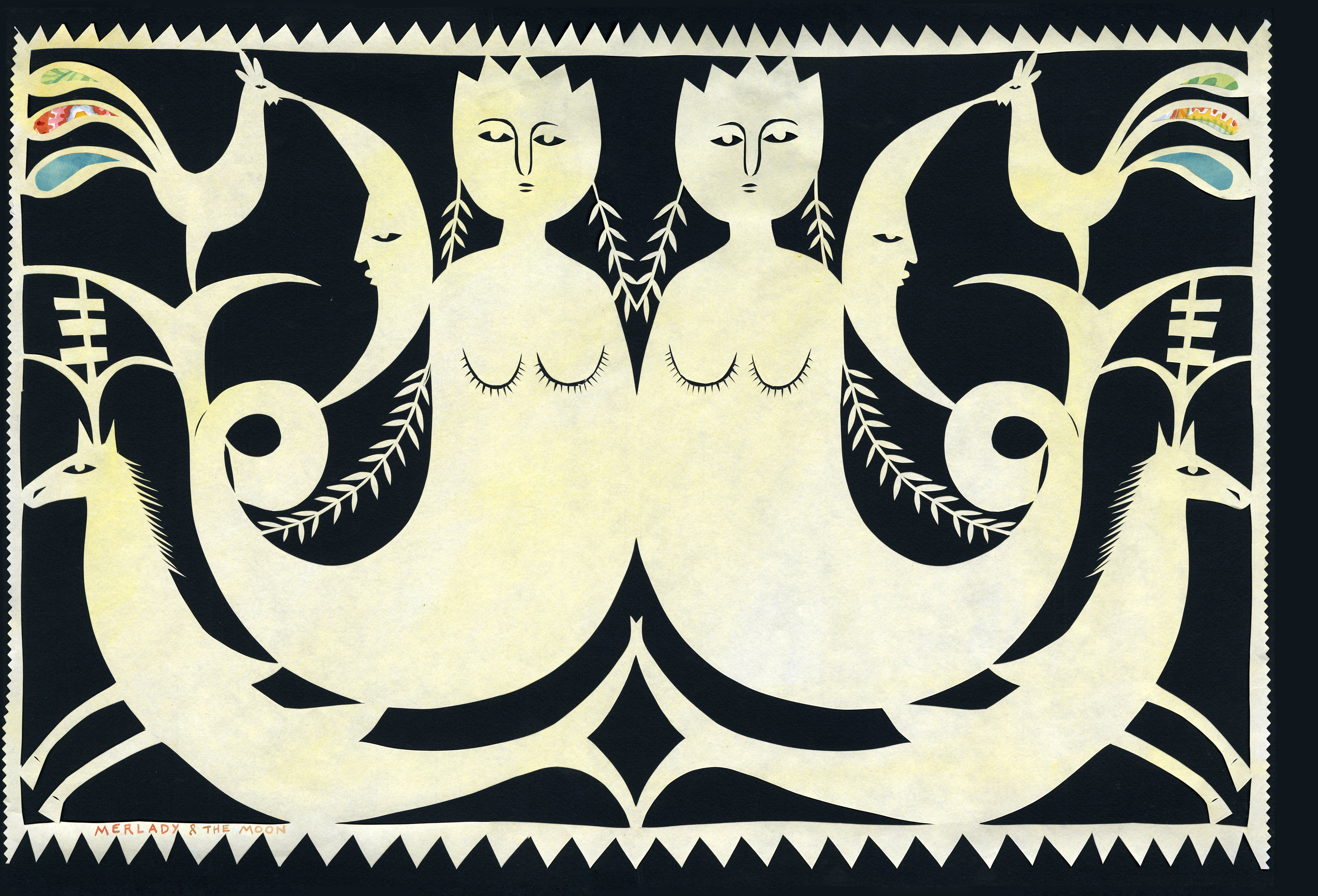 Most of my paintings are gouache and ink on paper. I also make work with different media like cut paper, stencil, embroidery and bread. The wandering that I do in my studio work keeps me alive creatively and feeds all of my other work.