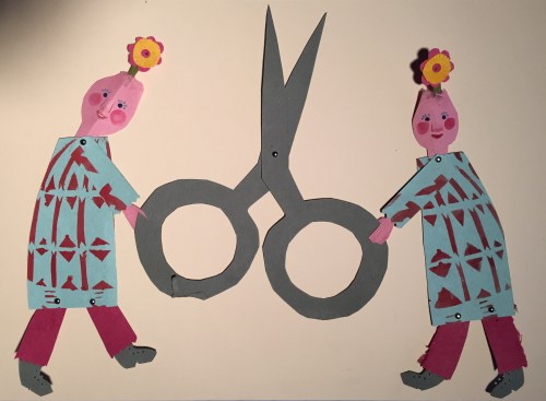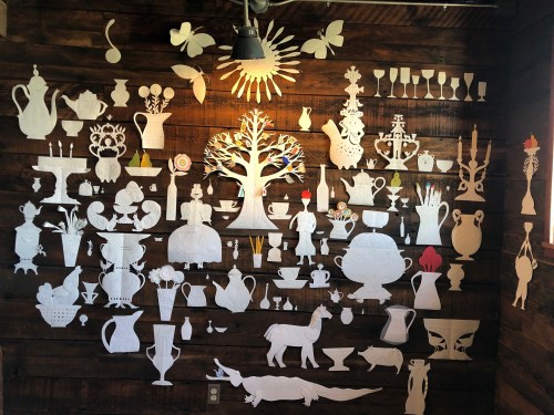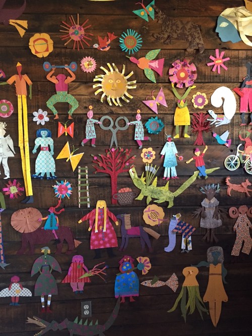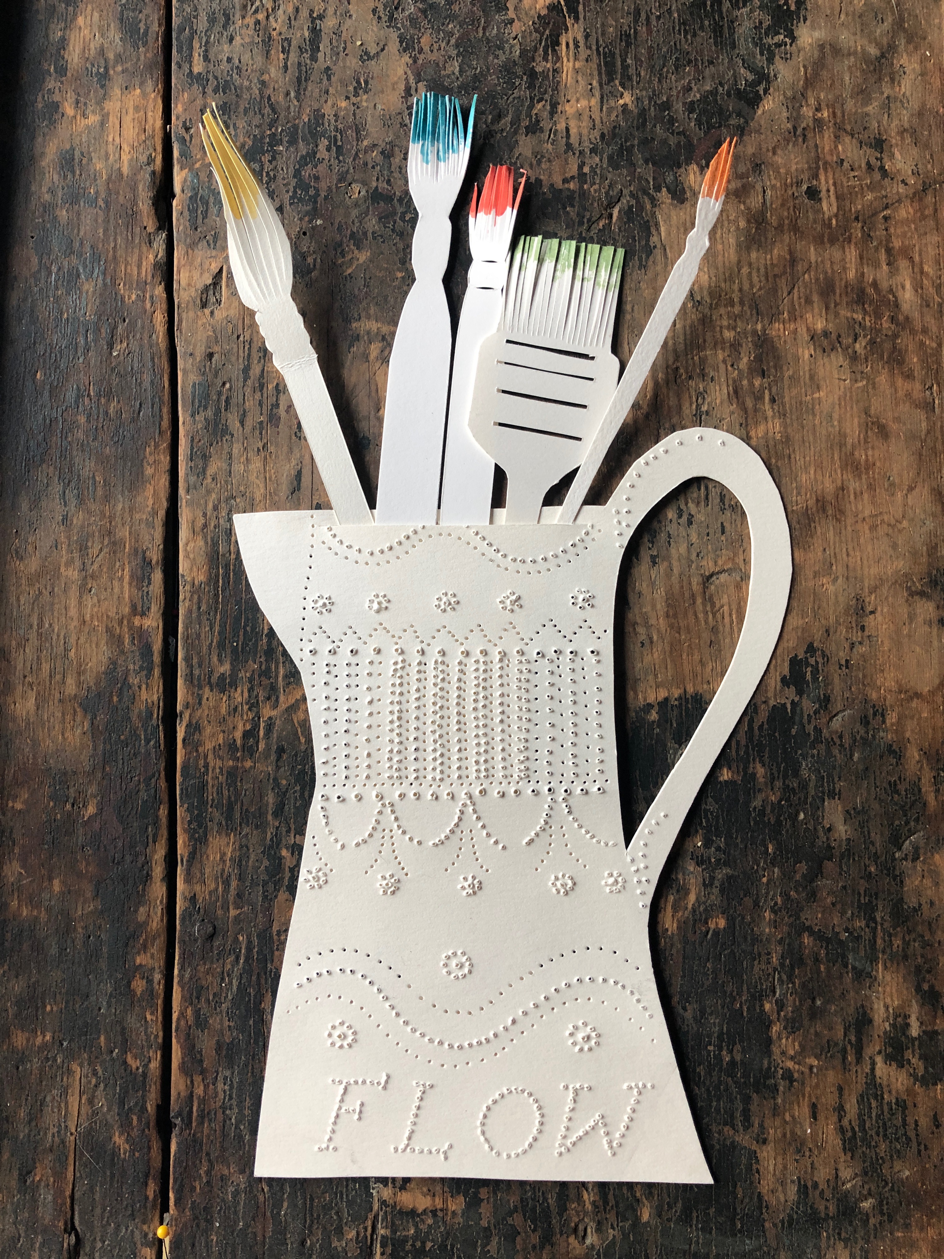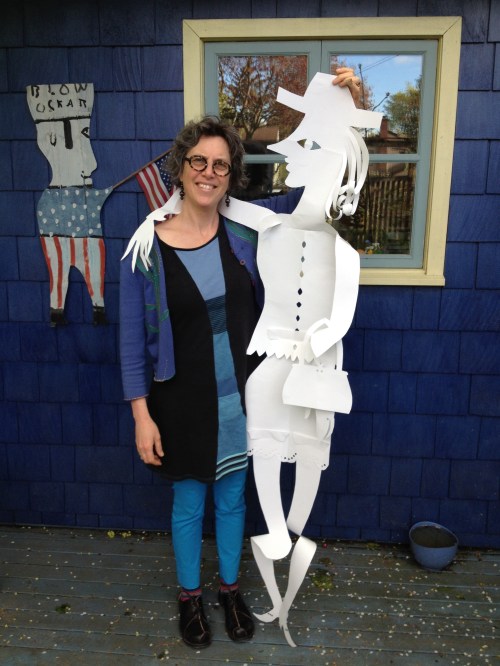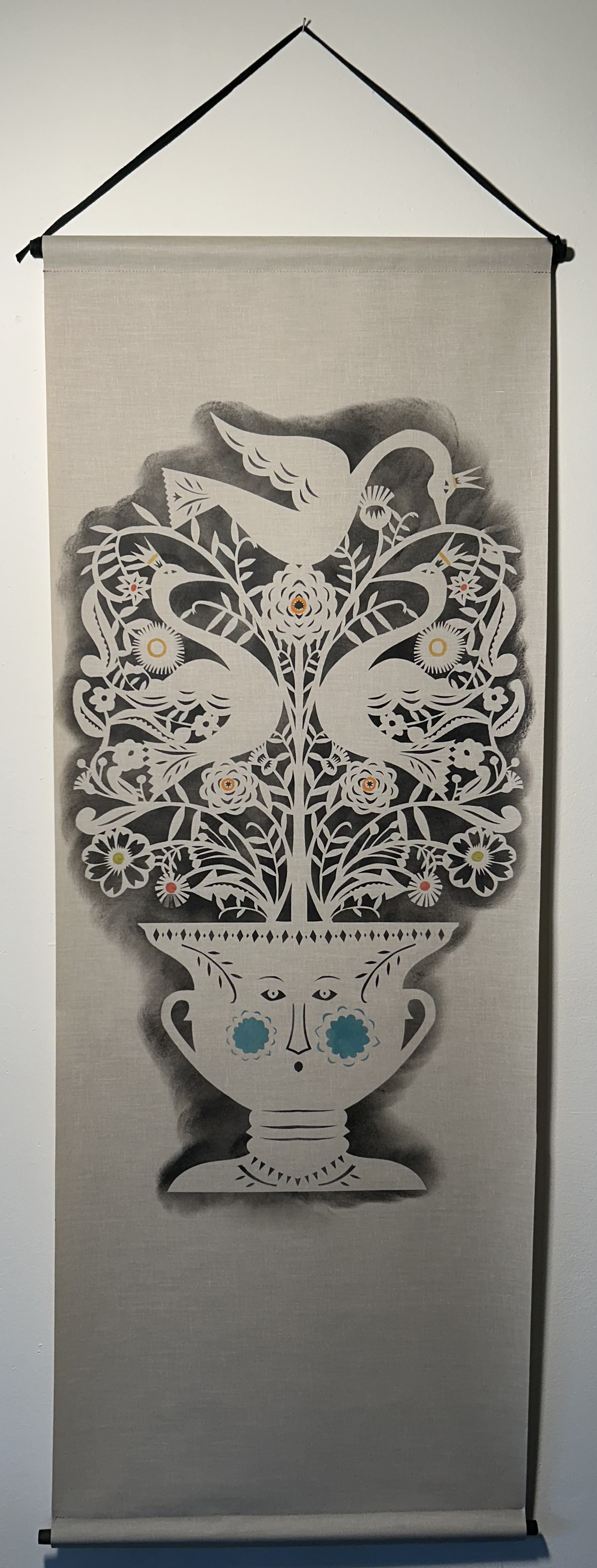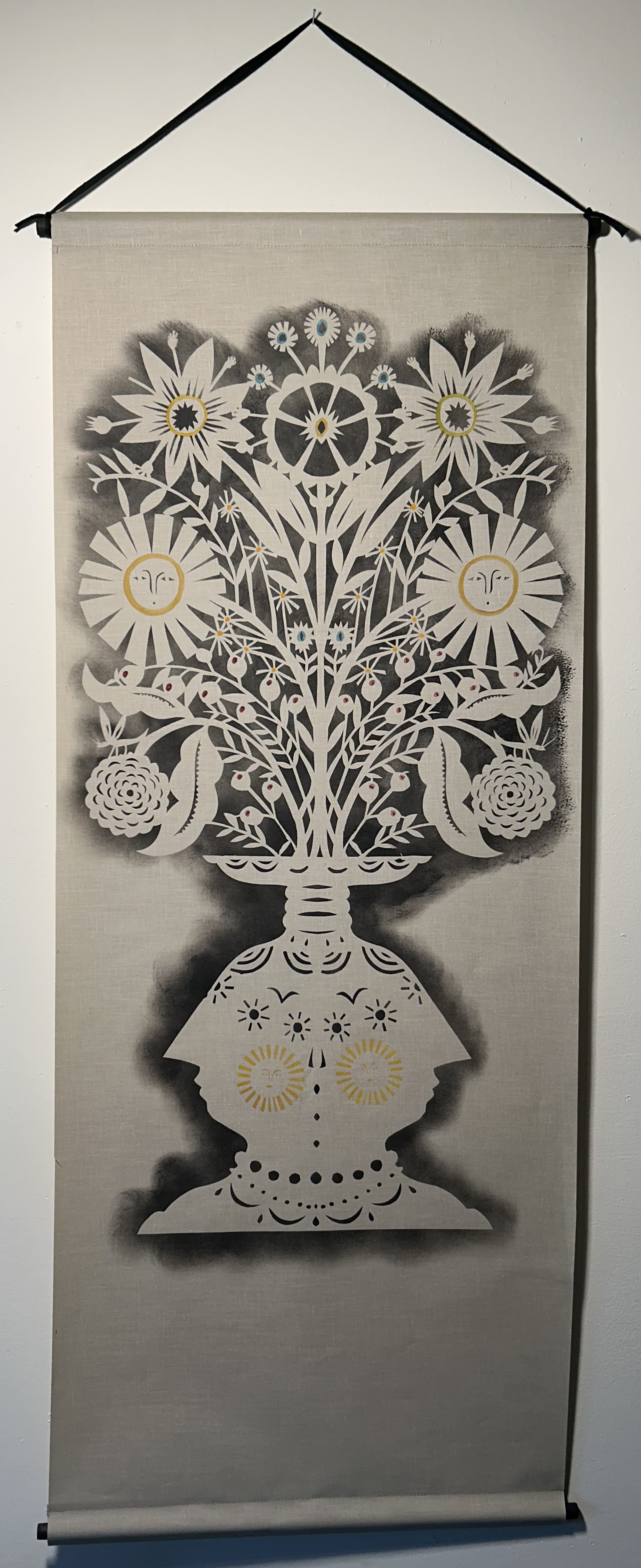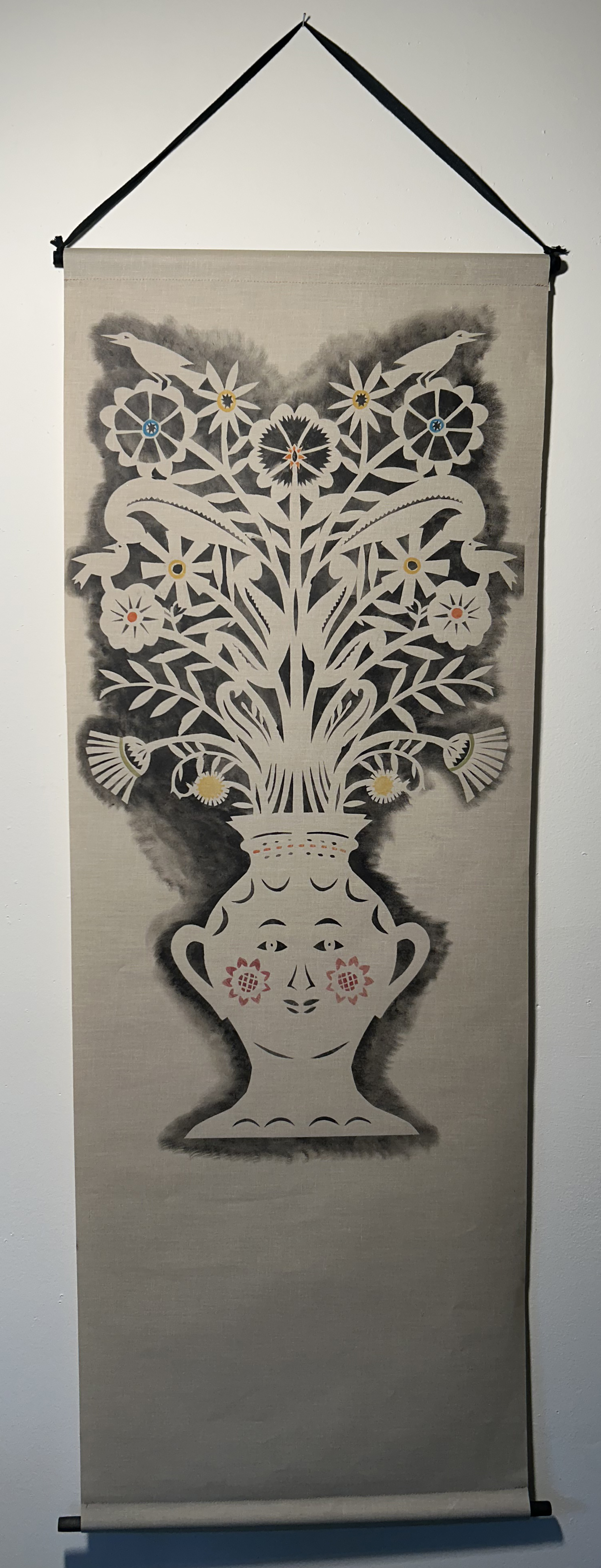 This spring I was part of a group show along with Deborah Mersky and Margaret Chodos-Irvine at the i.e gallery in March 2025 called Troika: Head, Body, Legs. The first 8 images (four paintings and four scrolls) are my part of that show. Jugheads is a series of woman/jugs. I am lucky to come from a line of creative women. My mother is a potter and I grew up with a love of dishes and decoration This series is a tribute to my mother, grandmother, aunts and other women in my life. The papercuts have cardboard frames inspired by Tramp Art. The banners are stenciled with textile ink and gouache onto linen buckram, a cloth often used for binding books.